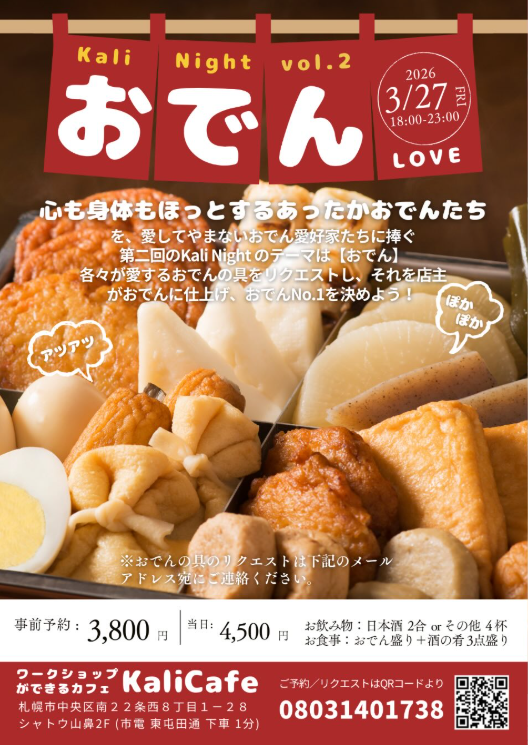 Kali-cafeにてお食事の方は、「小部屋2時間まで無料」サービスも行っています。詳しくはこちら>>