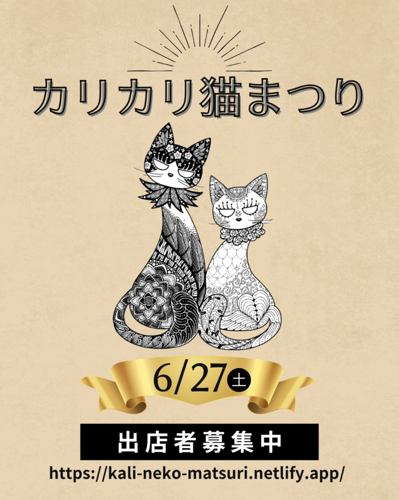 猫にまつわるハンドメイド雑貨、お菓子、占い、ワークショップなど、猫好きさんが楽しめるものなら幅広く歓迎!